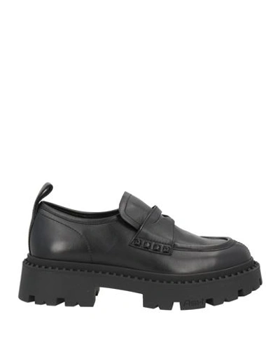Genial Stud leather loafers from ASH featuring black, calf leather, smooth grain, panelled design, logo at the sole, gold-tone stud detailing, pull-tab at the heel, round toe, slip-on style, branded leather insole and rubber lug sole.