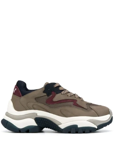 Taupe leather oversized lace-up sneakers from Ash featuring a round neck, a lace-up front fastening, mesh panels, a layered design and a ridged sole.