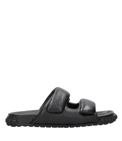 - Leather - Open toe - Two adjustable soft Velcro straps - Logo embossed on the front - Ergonomic logoed leather insole - Lightweight rubber outsole and rubber grommets on the edge.