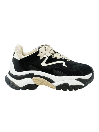 Addict low-top chunky sneakers from ASH featuring black, light beige, white, calf suede, round toe, panelled design, embroidered logo to the front, front lace-up fastening, branded heel counter, branded leather insole and chunky rubber sole.
