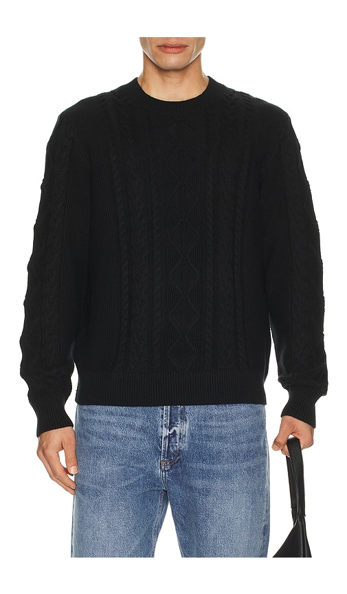 Asher Andre Cable Knit Sweater in Black. Size S (also in L, M, XL/1X). 90% cotton 10% cashmere. Dry clean only. Ribbed trim. Midweight cable knit fabric. AHEX-MK10. L906.