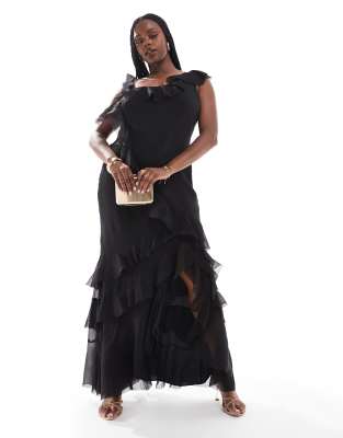 ASOS CURVE Asos Design Curve Asymmetric Shoulder Bias Cut Maxi Dress With Ruffle Details In Black