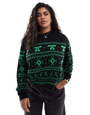 ASOS CURVE Asos Design Curve Crew Neck Christmas Sweater With Fairisle Pattern In Black And Green-multi
