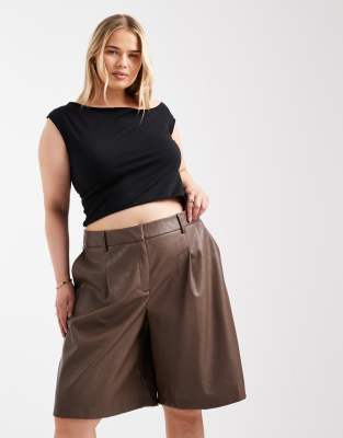 Asos Design Curve Leather Look Longline Pleat Front Safari Shorts In Brown