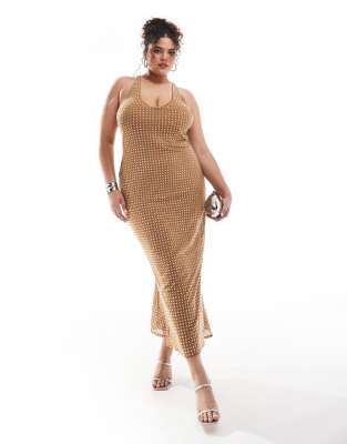 Asos Design Curve Scooped Halterneck Midi Dress In Laser Cut Hotfix In Tan-brown