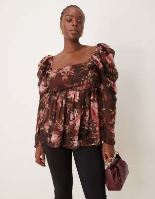 Tops by ASOS Curve *Saves to inspo folder* Floral design Square neck Fitted top Pleat detailing Blouson sleeves Stretch, shirred back panel Regular fit