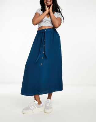 Button Through Midi Skirt With Tie Waist In Navy-blue