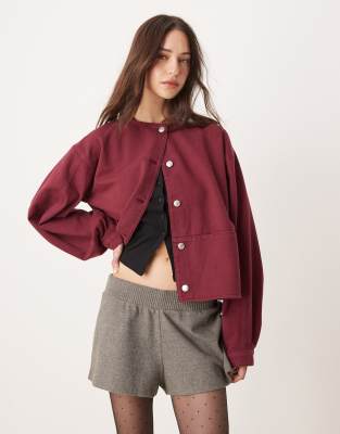 ASOS DESIGN Denim Collarless Jacket In Burgundy-red