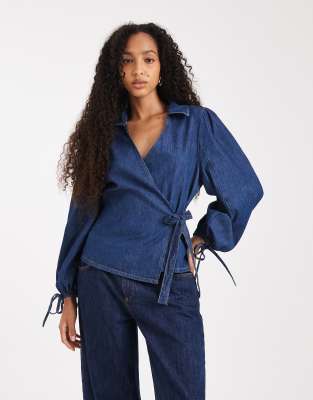 ASOS DESIGN Denim Wrap Top With Balloon Sleeves In Blue