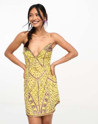 Embellished Structured Plunge Mini Dress With Curve Hem In Yellow