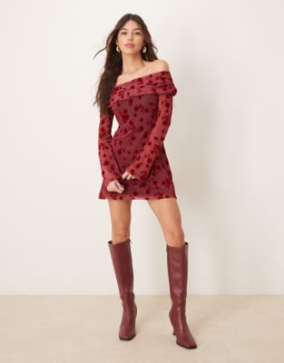 ASOS DESIGN Fold Over Flocked Mesh Asymmetric Mini Dress In Red