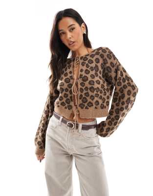 ASOS DESIGN Knitted Tie Front Leopard Print Cardigan With Bow Detail In Mocha-multi