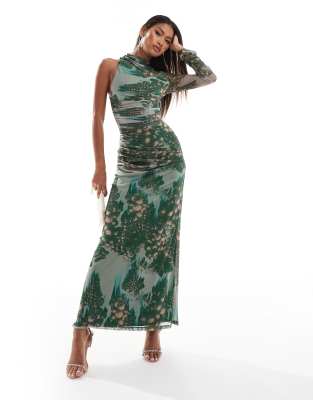 ASOS DESIGN Mesh High Neck One Sleeve Midi Dress With Gauging In Green Grape Print-multi