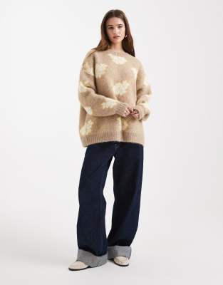 Cardigan by ASOS DESIGN Crew neck Drop shoulders Long sleeves Floral pattern Ribbed trim Oversized fit