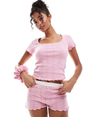 ASOS DESIGN Pointelle Short Sleeve Top & Shorts Pajama Set With Scrunchie In Pink