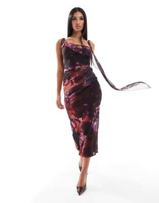 ASOS DESIGN Rouleaux Strap Mesh Cowl Midi Dress With Drape Tie Detail In Grape Print-multi