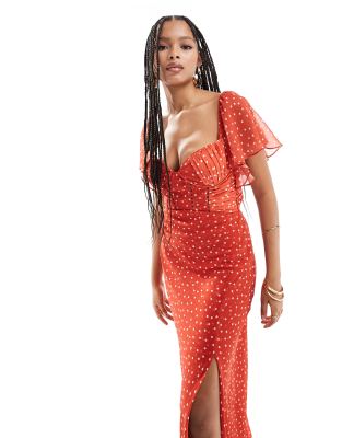 Dresses by ASOS DESIGN Thanks, it's ASOS Spot design Sweetheart neck Corset bodice Flutter sleeves Cut-out back Button-keyhole back Front slit Regular fit