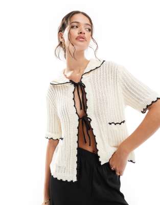 ASOS DESIGN Scallop Edge Collar Cardigan With Ties In Cream With Black Tipping - Part Of A Set-white