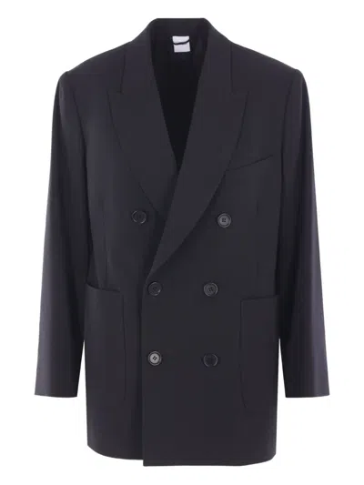 Aspesi double-breasted jacket made of black wool blend. Featuring peaked lapels, button closure, multiple pockets, long sleeves with buttoned cuffs, and a central back vent. Fully lined interior.