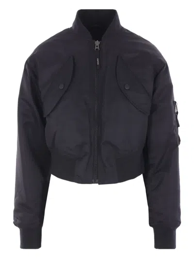 Aspesi cropped padded bomber jacket made of black nylon. Featuring a bomber collar, zip closure, multiple pockets, long sleeves, and ribbed knit trims.
