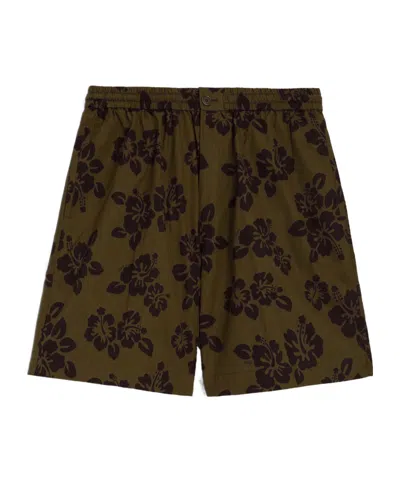 All-over hibiscus print, elastic waistband with internal drawstring, two side pockets, two welt pockets on the back, with convenient zip and button closure, and a loose fit.