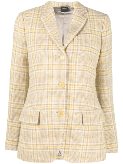 This refined single-breasted blazer showcases a classic notched lapel and a sophisticated front button closure. Crafted from 100% virgin wool, it features a soft plaid pattern in tones of beige and yellow, adding an elegant touch. The tailored fit is complemented by structured shoulders and practical flap pockets, making it suitable for both professional and casual settings. 100% virgin wool Single-breasted design Classic notched lapel Front button closure Soft plaid pattern Tailored fit Structured shoulders Flap pockets