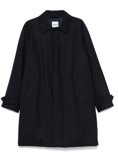 navy blue water-repellent padded design concealed front button fastening classic collar long sleeves buttoned cuffs chest welt pocket two side welt pockets central rear vent full lining straight hem