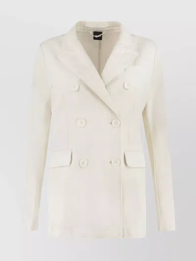 double-breasted two-piece suit from ASPESI featuring off-white, cotton-linen blend, peak lapels, curved hem, double-breasted button fastening, long sleeves, slip pocket to the front, two front flap pockets, straight leg, concealed front fastening and rear slit pocket.