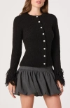 Textured to tempt and cut for a trim line, this cardigan sets the tone with crystal-embellished buttons that catch every shift of light while soft fringe at the cuffs adds movement. Front button closure Crewneck Long sleeves 100% polyester Dry clean Imported