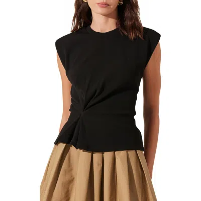 Strong shoulders frame this stretch-knit top designed with a gathered-and-twisted waist. Crewneck Cap sleeves 95% polyester, 5% elastane Hand wash, line dry Imported