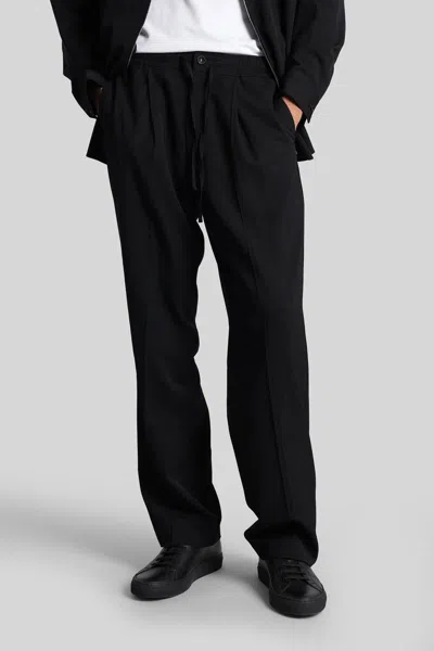 Pants in black wool, flap closure, elasticated waistband, side pockets, back pockets, straight leg, 100% wool, Made in China, the models is 1.83 and wears size 15++, the models is 1.91 and wears size 3