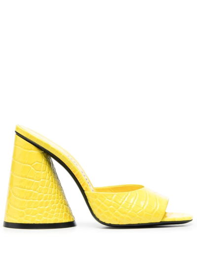 THE ATTICO Luz 105 Mule in Pale Yellow - Yellow. Size 40 (also in 36, 36.5, 37, 37.5, 38, 38.5, 39.5). Croc-embossed leather upper with leather sole. Made in Italy. Leather lining and footbed. Rounded square toe with oversized cone heel. Approx 105mm/ 4.15 inch heel. ATTF-WZ51. 227WS502 - EL002 - 044. About the designer: Attico represents a time where glamour ruled and decadence was a way of life. Derived from the Italian word for penthouse, Attico is reviving the way a woman gets dressed. Launched in 2016, Italian designers Giorgia Tordini and Gilda Ambrosio partnered up to combine their contrasting aesthetics to push the boundaries of specialty couture. Inspired by vintage interiors and seductive boudoirs - expect pieces dripping in artisanal detail, opulent evening gowns, lavishly bold patterned silk robes, and rich textured velvets.