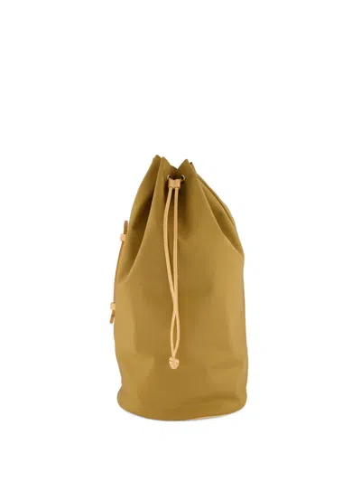 camel brown drawstring fastening adjustable shoulder strap side handle internal slip pocket silver-tone hardware