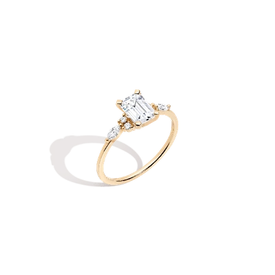 Short: The bouquet of your dreams Long: A lovely and delicate bouquet of diamonds awaits you. One perfectly selected emerald cut diamond is decorated in a garland of diamond whimsy, with two round and one marquise diamond on each side creating a sparkling floral motif that will always leave you feeling like spring. | Emerald-Cut Floral Diamond Ring