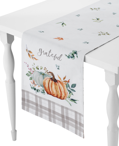 The Avanti grateful patch table runner is decorated with printed pairs of colorful pumpkins and leaves with multi-shade linen borders on both ends. The center features tossed colorful fall leaves on an ivory ground. The textured cloth is polyester, cotton for easy care. Other Dining Categories - Table Linens (new)
