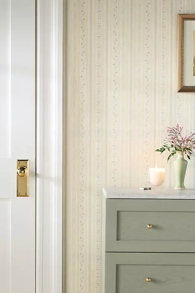 To calculate the square footage of your space, we recommend combining the width of each wall, then multiplying this number by your ceiling height. Next, divide this number by the square footage of a single roll of wallpaper to determine the number of rolls required. Always round up to account for pattern repeat and variation. Need help choosing the right wallpaper for your home? Read our guide to transforming your walls - and your space. Orchard Stripes Floral Wallpaper by Ayara in Beige at Anthropologie
