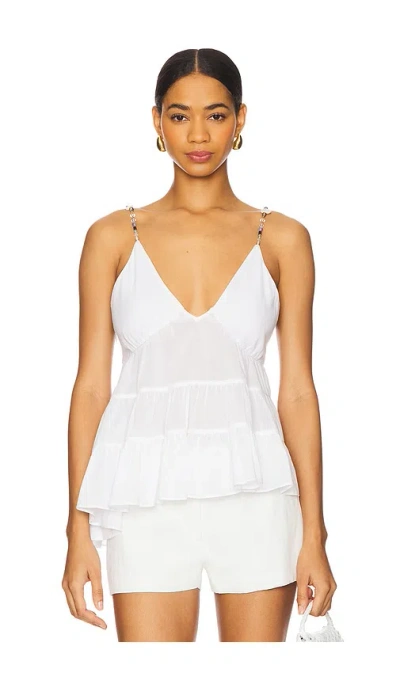 Azeeza Viola Top in White. Size L, M, S. Voile textile. Imported. Hand wash recommended. Hidden side zipper with hook eye closure. Beaded straps. Garment is made with a semi-sheer fabric, undergarments can show through. AZER-WS15. VIOLA TOP.