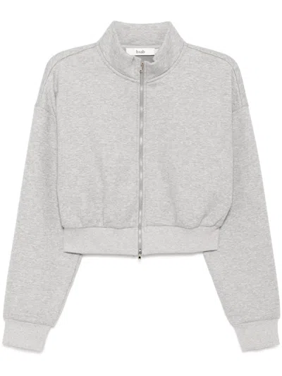 grey cotton blend jersey texture front zip fastening high neck long sleeves ribbed cuffs and hem cropped