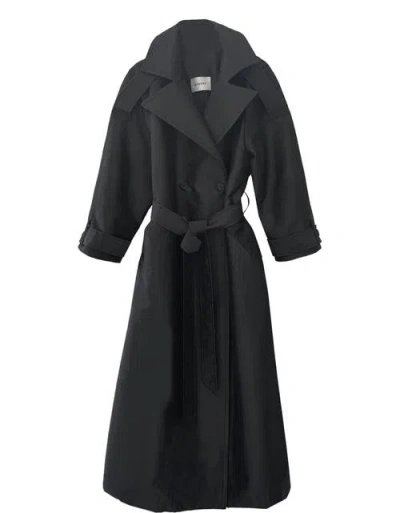 Drama for days. This timeless trench coat is made in a stunning light blue dupioni fabric which is light as a feather but keeps its shape. The trench coat floats on the body giving a soft but structured feel. Slightly oversized and designed for travel, it is a great layering piece. To be worn over suiting, eveningwear, or we love how it adds a stylish twist to simple denim or even lace. Large collar stand, Classic trench styling, Raglan sleeves, Tabs with button for adjusting on cuffs, Oversized Epaulette (tabs) on shoulders, Double breasted; keyhole button holes, Extra long self tie belt, 100% Polyester, dry clean only