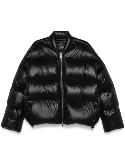 black recycled down padded design front two-way zip fastening baseball collar drop shoulder long sleeves with internal ribbed cuffs two press-stud fastening side pockets full lining drawstring hem