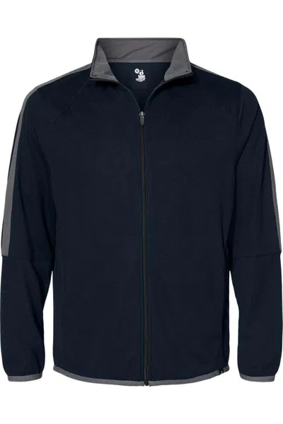 5 oz./yd, 100% polyester fabric. Contrasting inside collar, shoulder and sleeve inserts. Badger sport shoulder for maximum movement. Self-fabric collar with full length locking zipper. Two front zipper pocket with headset opening. Soft elastic binding sleeve and bottom hem. Drop tail hem. Badger "B" woven loop label on bottom hem.