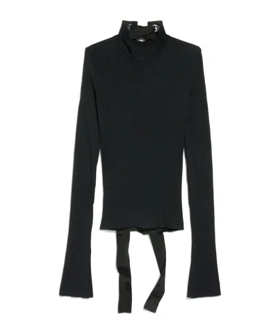 A fitted black sweater from Balenciaga features a contemporary aesthetic with ribbed texture and high neckline. Long sleeves flare at the cuffs, while a unique lace-up detail at the front merges modern design with versatile wearability. This piece is ideal for elevating any wardrobe, reflecting sophistication and innovation.- Fitted design- Ribbed texture- High neckline- Flared cuffs- Lace-up front detail- Versatile wearability