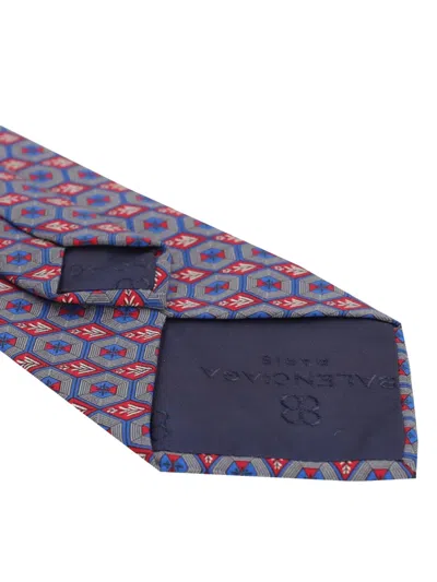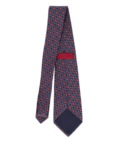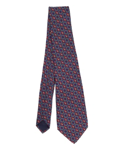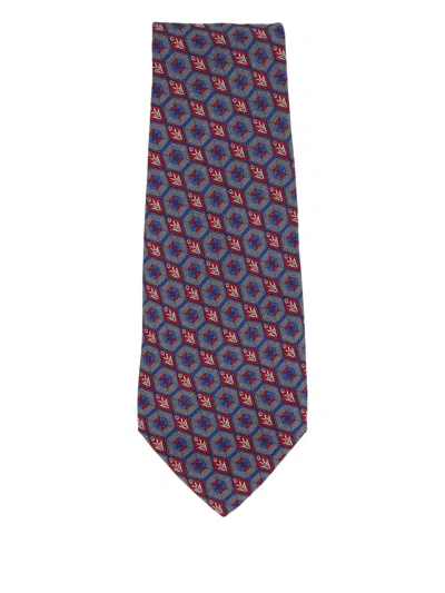sapphire blue silk geometric-pattern print self-tie fastening pointed tip internal logo patch Condition: GOOD. This previously owned and used item is in good condition with minimal signs of use. This may include fading of material or plating and scratches.