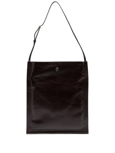 Bally shoulder bag made of dark bordeaux crackled leather. It features gold-colored hardware, an adjustable shoulder strap, and a tone-on-tone suede-lined interior. The design is completed with the golden Bally logo on the front.