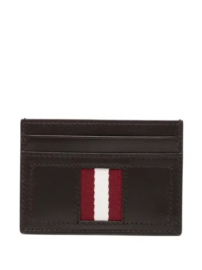 Thar card holder in brown embossed leather with iconic red and white Bally Stripe detail on the front, silver metal logo on the front, one central pocket, and four card slots. Composition: 100% Cowhide