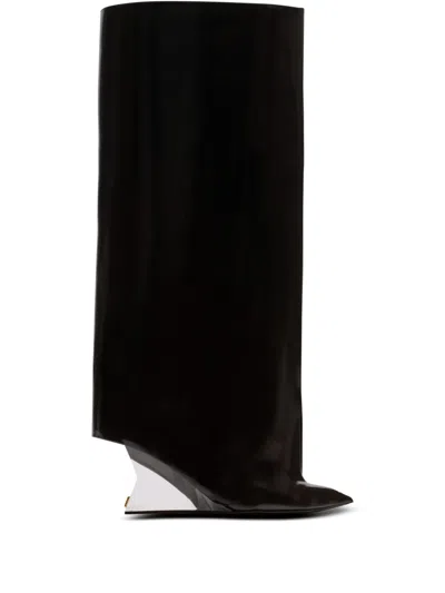 black calfskin leather wedge heel gold-tone logo detail pointed toe