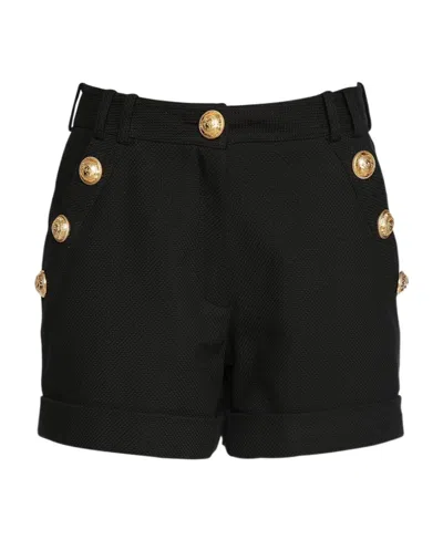 Black buttons decorative shorts, front buttons and invisible zipper opening and closing, gold metal buttons, and two rear sticker pockets.