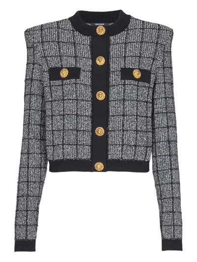 black and grey tweed effect button fastening round neck long sleeves patch pockets