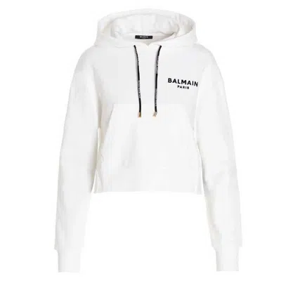 Balmain Ladies Tops. Fashion category: Hoodies & Sweatshirts. SKU: XF0JP000BB01-GAB. Color: Gab Blanc/Noir. Balmain Cropped Cotton Flock Hoodie. This eco-designed cropped cotton sweatshirt features long sleeves, a drawstring hood, and ribbed details, accented with a flocked white Balmain logo. 100% cotton. Made in Portugal.