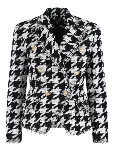 Balmain introduces a double-breasted blazer made from a luxurious white cotton blend with a houndstooth pattern. The design includes frayed detailing, classic lapels, and a button closure, along with side flap pockets and buttoned cuffs. This blazer is a stylish and sophisticated choice for any wardrobe.- Double-breasted design- White cotton blend- Houndstooth pattern- Frayed detailing- Classic lapels- Button closure- Side flap pockets- Buttoned cuffs